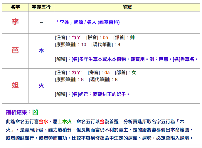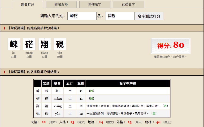 總不能用個螞蟻的蟻、崩塌的崩 這種為了湊筆畫、屬性的字吧!『八字算命網–姓名打分』可以得知每個字的在姓名學中的解釋,姓名欄位最多各可測兩個字,可以一併把想知道的字義丟上去看看,找到喜歡的字後,再來看看下方針對名字三才配置的測算結果。